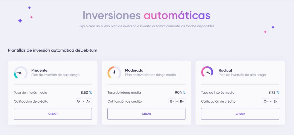 Podemos invertir de forma manual en cualquiera de las operaciones a partir de 10 euros por préstamo o bien elegir una de las 3 estrategias que aparecen en la pestaña INVERSIONES AUTOMÁTICAS (PRUDENTE, MODERADO o RADICAL) que repartirán el capital disponible entre todas las operaciones que cumplan con los criterios predefinidos, pudiendo crear también nuestra estrategia automática (Autoinvest) personalizado.