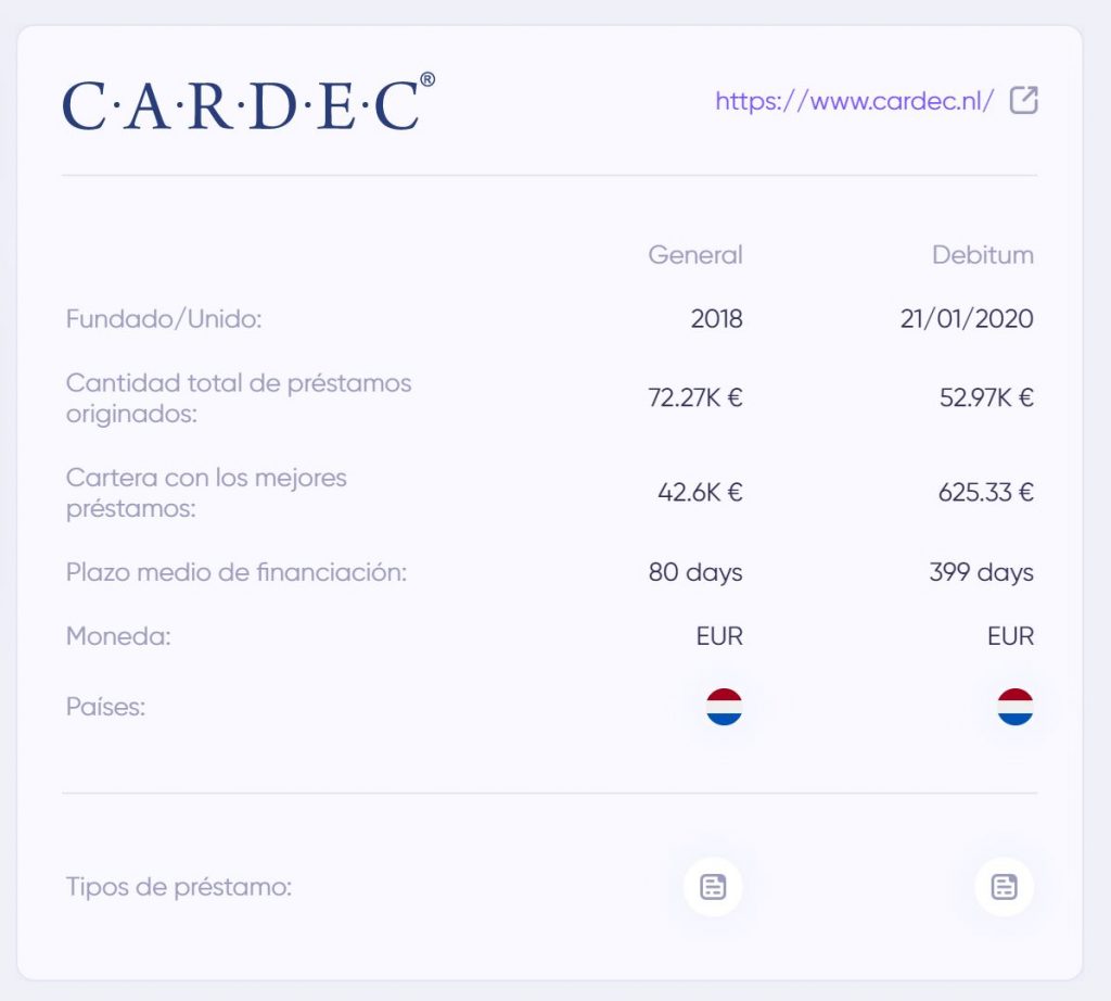 Cardec Factoring se crea en 2018 con el objetivo de proporcionar servicios financieros para abogados y con la vocación de expandirse a otros sectores. El plazo máximo de sus préstamos es de 400 días pero de media suelen presentar duraciones inferiores a 3 meses