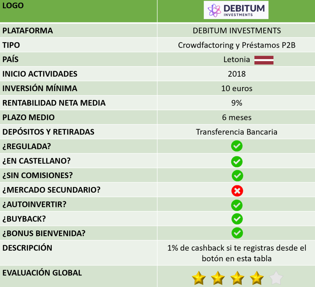 Debitum Investments es una web de préstamos P2B y crowdfactoring letona surgida a comienzos de 2018 que poco a poco ha conseguido posicionarse como una de las plataformas de préstamos empresariales más fiables y robustas, con características únicas como un análisis cuantitativo de riesgos independiente de cada activo publicado o la presencia de activos reales como garantía en cada operación -como elemento de seguridad adicional al Buyback-