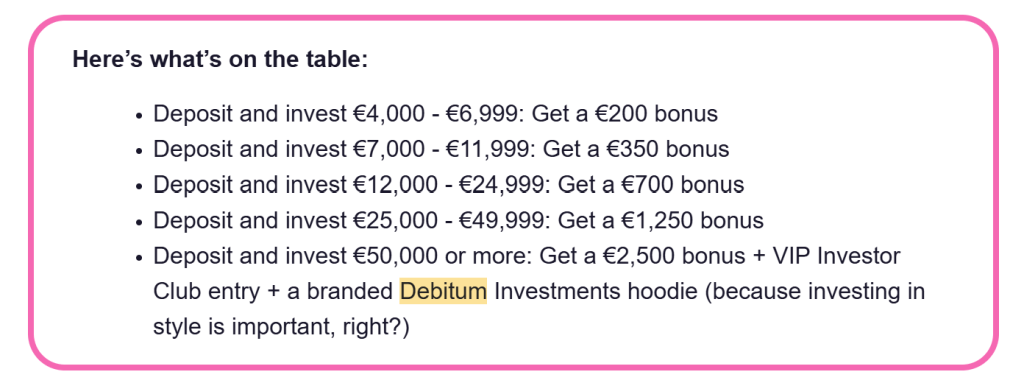 Las últimas campañas promocionales de Debitum Investments en 2024 fueron un gran éxito, con cientos de inversores reclamando rápidamente su parte del pool de bonus y agotando la promo en cuestión de días… Y seamos sinceros, crowdlender, esta primera campaña de 2025 no será muy diferente… así que si quieres tu parte del pastel… ¡deberás actuar rápido!