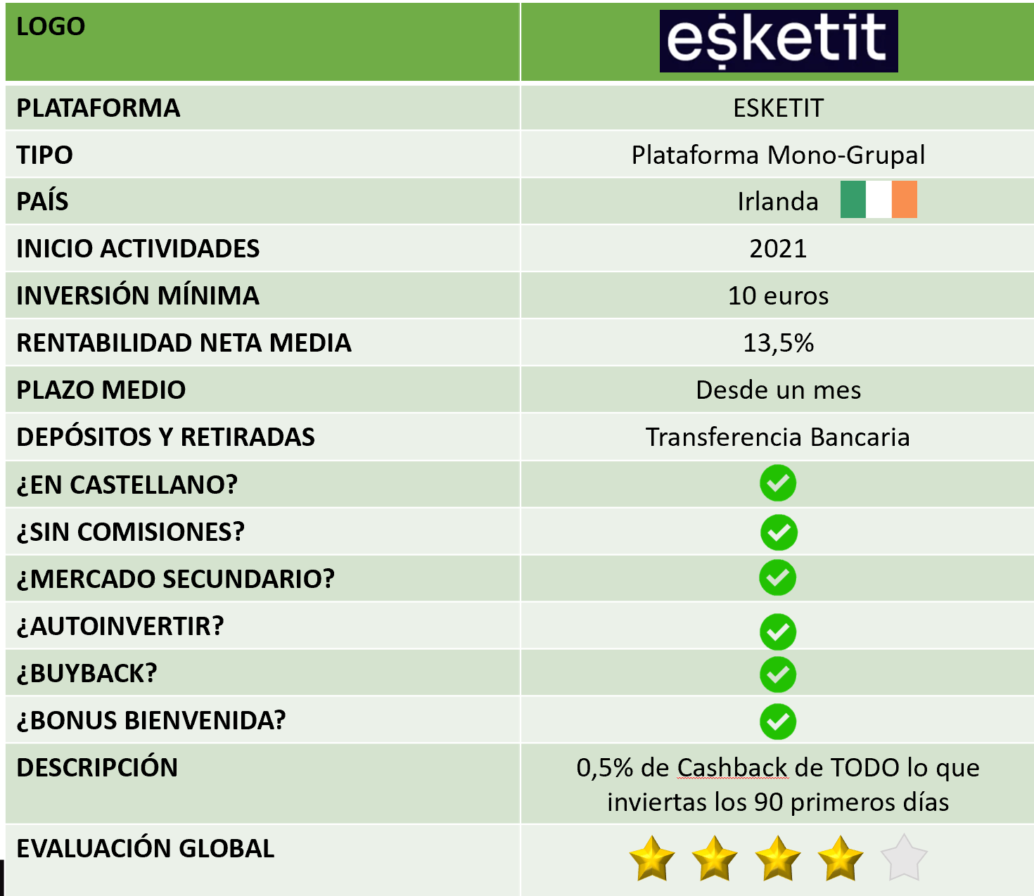 RENTABILIDAD: Esketit presenta una rentabilidad por encima de la media comparada con otras plataformas representativas del sector, con una media en el entorno del 12,5% anual y un rango típicamente comprendido entre el 10 y el 14%