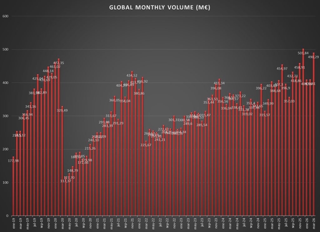 En marzo de 2026 el volumen global de operaciones financiadas en el conjunto de las plataformas que analizamos ha sido de 490,29 millones de euros, lo que supone un avance del 19,64% con respecto al mes anterior y valores que se sitúan aproximadamente un 2% por debajo de los máximos marcados a finales de 2025.