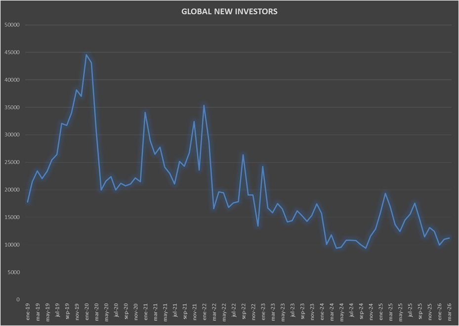 Por otra parte, en marzo 2026, la industria crowd en su conjunto ha sumado 11.234 nuevos inversores contando el sumatorio de plataformas de las que tenemos datos, lo que supone un ritmo de crecimiento un 2,07% por encima del mes anterior que nos deja en valores en el entorno de apenas un 27% de los máximos marcados a principios de 2020.
