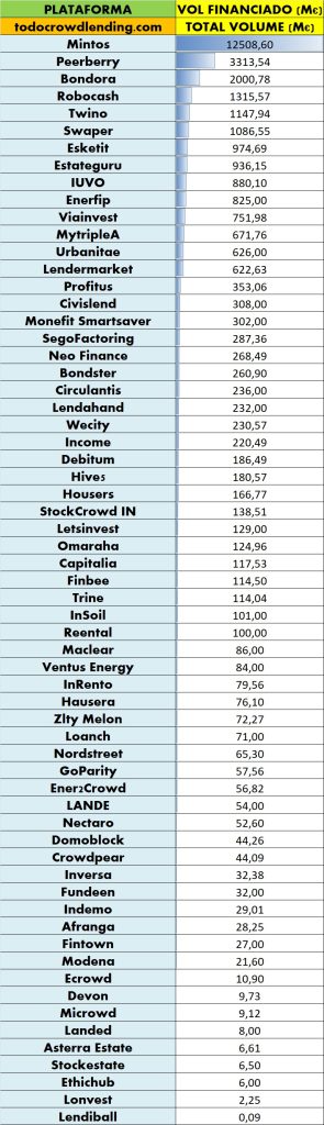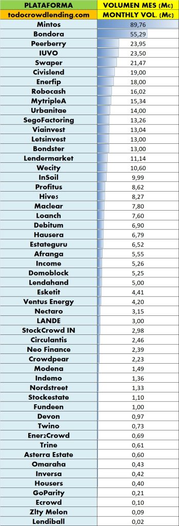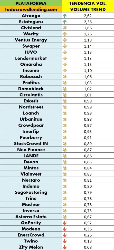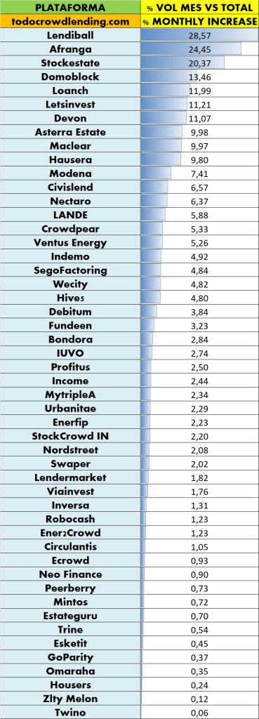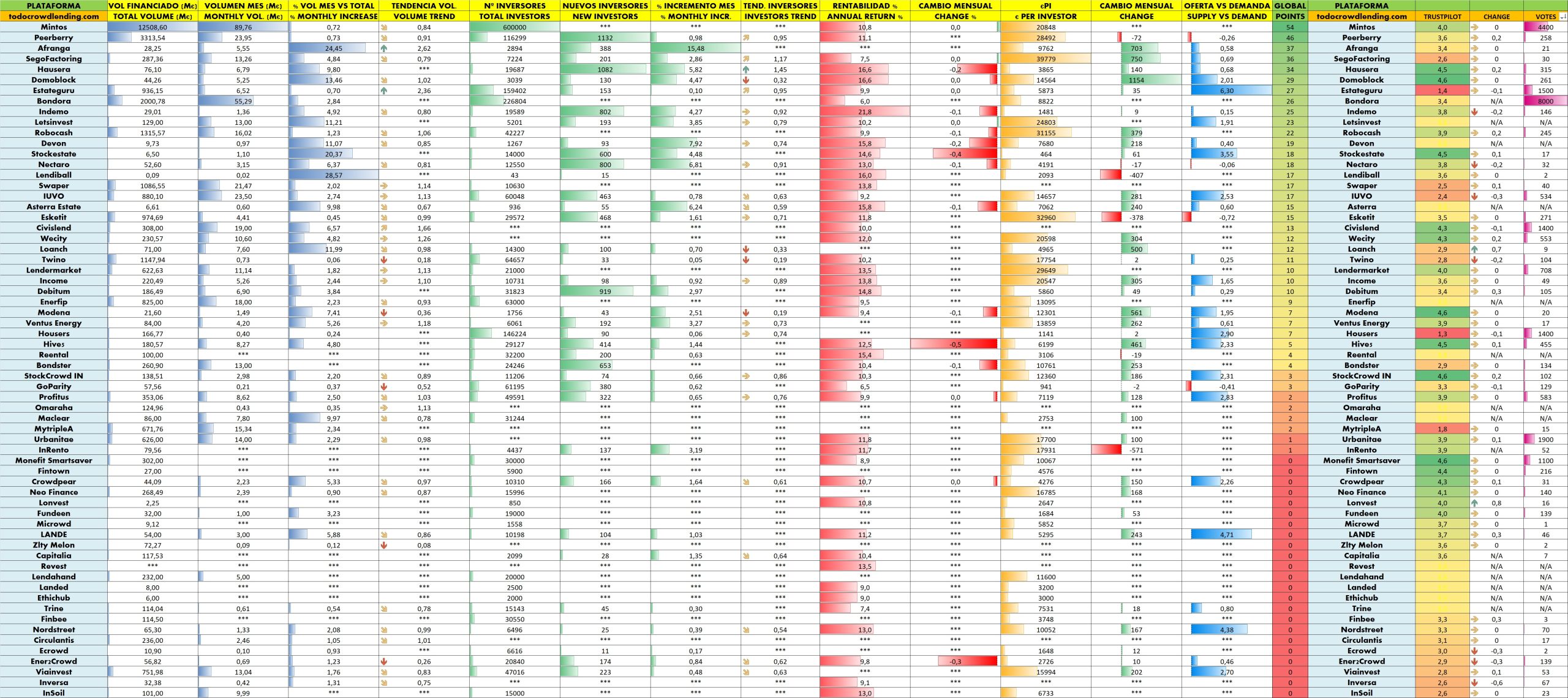 En esta sección podemos observar de un vistazo las plataformas que más crecen en el mes: las que llevan una mejor tendencia de crecimiento en cuanto a volumen financiado, dando un idea de su potencial a corto-medio plazo.