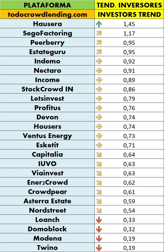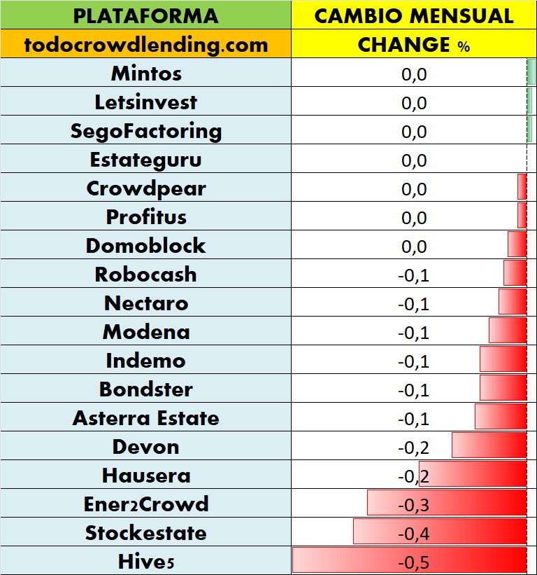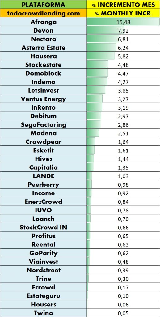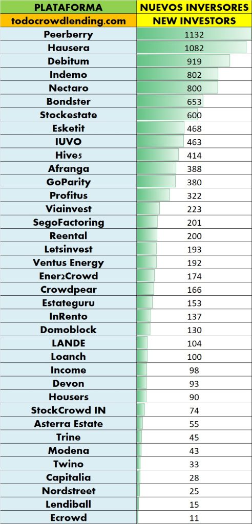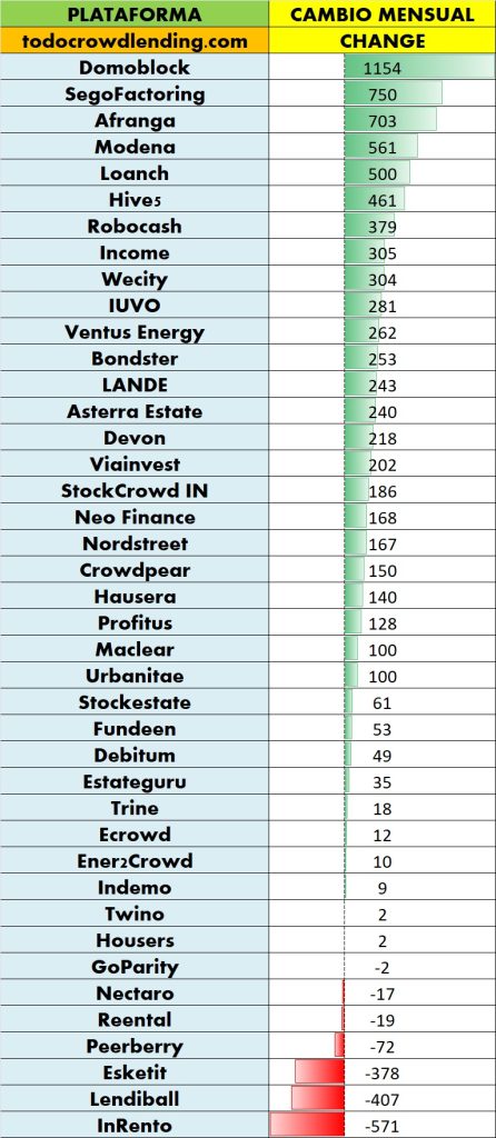 Esta métrica que relaciona las nuevas incorporaciones en el mes con respecto a la base de inversores ya existente expresada en porcentaje, es muy interesante para constatar el grado de popularidad a corto plazo de una determinada plataforma y las probabilidades crecimiento exponencial en los próximos meses. Los líderes de esta clasificación suelen ser plataformas relativamente pequeñas pero que están llamadas a ser grandes actores del mercado en los meses o años venideros.