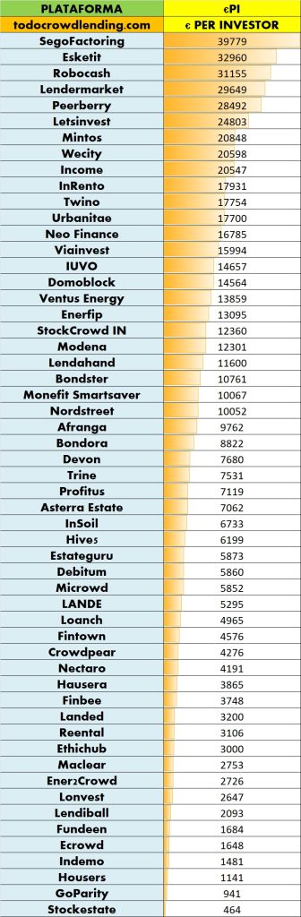 Si dividimos el volumen total de préstamos financiados en euros de cada plataforma entre el número de usuarios registrados como inversores, obtenemos otro parámetro estadístico de lo más interesante: cuál es la inversión media por usuario en cada plataforma, lo cual es un indicativo de confianza, oferta y diversificación de la web en particular.