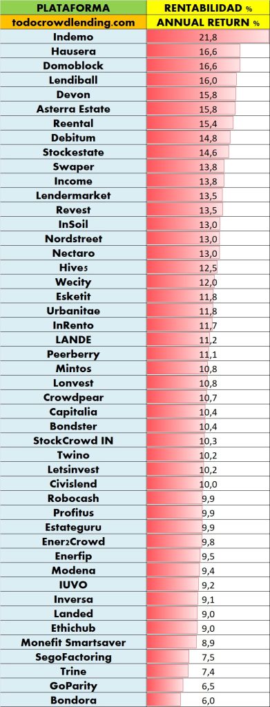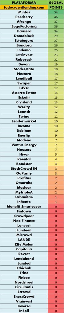 ¡Ojo!, las plataformas de las que no hemos podido obtener datos porque no están publicados en su web aparecen con puntuación «0», lo cual NO significa en absoluto que no sean también buenas plataformas de crowdlending. Recordad que tenemos nuestro TOP 10 de mejores plataformas de crowdlending en base a nuestra experiencia real como inversores en cada una de las webs, no a datos autopublicados.