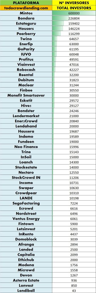 En esta sección echamos un vistazo a la cantidad de usuarios registrados como inversores en las plataformas. El número de inversores es un indicador del apoyo y la confianza de la comunidad con respecto a una web de inversión en concreto. Nótese que dependiendo del criterio de cada plataforma, en ocasiones se computan como inversores usuarios registrados que todavía no han realizado una primera inversión.