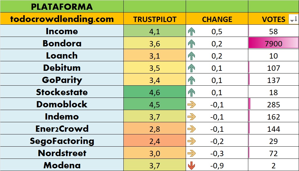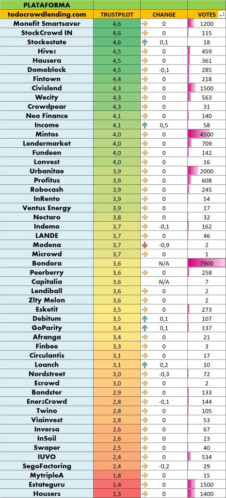 Y terminamos nuestro informe con nuestro ranking de confianza de plataformas crowd, que ya sabéis que está basado en los datos del reputado agregador de opiniones Trustpilot