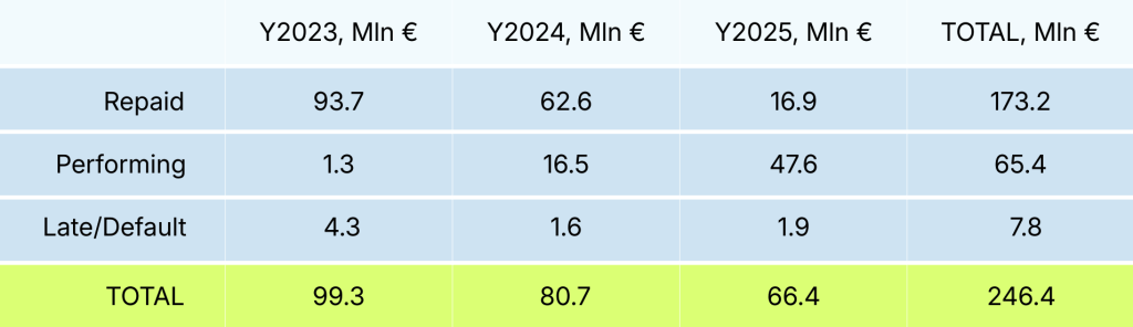 En cuanto a la cartera, en los últimos tres años, Estateguru ha originado préstamos por un total de 246,4 millones de euros. De esta cantidad, 173,2 millones de euros ya se han reembolsado a los inversores, mientras que 65,4 millones de euros se encuentran actualmente en proceso de pago y se están reembolsando según lo previsto. Solo 7,8 millones de euros, o aproximadamente el 3%, del volumen total originado durante este período se puede clasificar como vencido o en mora.