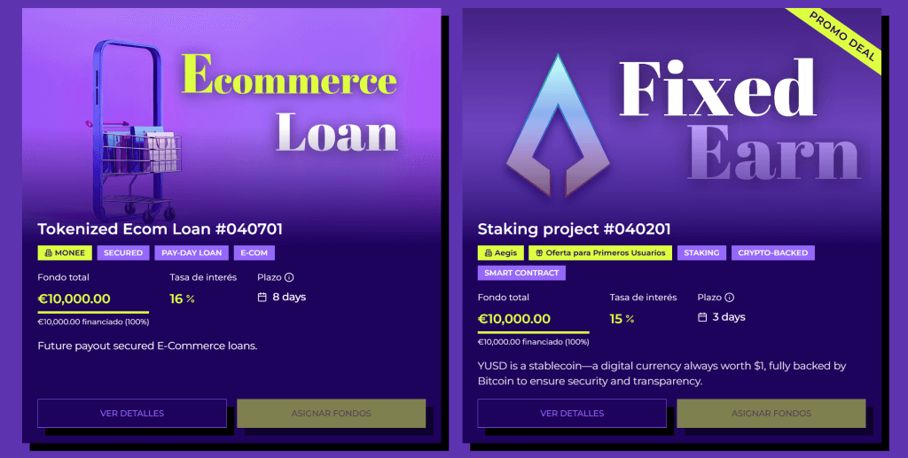 3) Interesante mix de activos invertibles en su marketplace, con préstamos tokenizados, operaciones de staking y en un futuro próximo su producto Dynamic Earn.