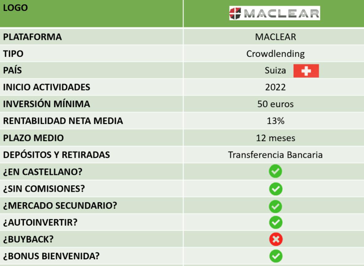 *Maclear AG es miembro de PolyReg SRO, un ente auto-regulador bajo la supervisión de la FINMA (Organismo competente en materia financiera en Suiza), siendo pues una plataforma regulada y supervisada conforme al marco normativo de su país de origen.