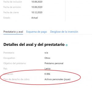 En Mintos, para cada uno de estos préstamos podremos comprobar qué activo ha sido pignorado y qué LTV (loan to value) genera la valoración de ese activo pignorado (aquí, como en los préstamos hipotecarios, cuanto menor LTV, mejor, y de nuevo también es importante una adecuada valoración de los activos por parte del prestamista, para asegurarnos recobro en caso de impagos).